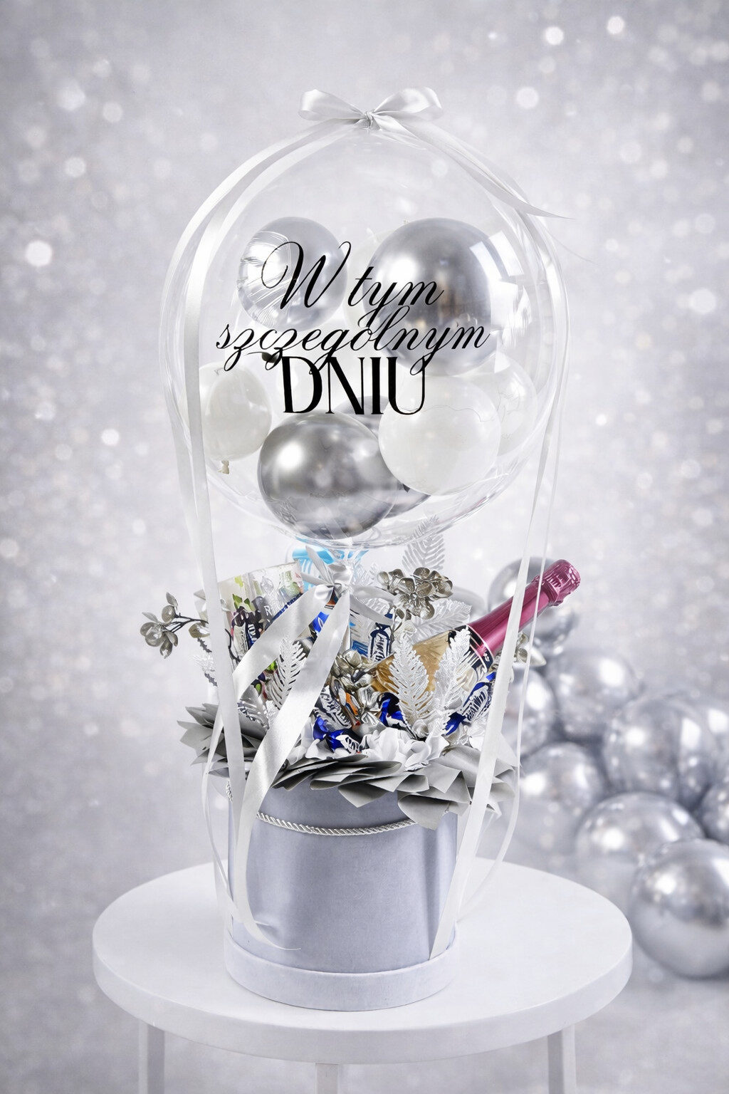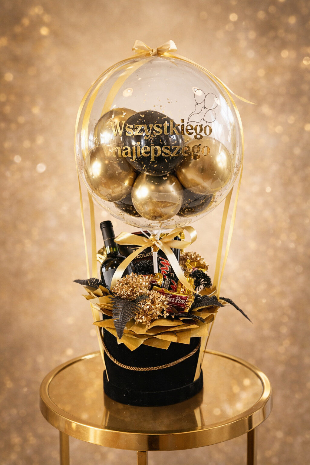 Każda kompozycja tworzona jest ręcznie, z dbałością o detale i estetykę. Przezroczysty balon z dedykacją unosi się nad stylowym boxem, w którym mogą znaleźć się upominki dobrane do okazji – słodkości i inne drobne prezenty lub dekoracyjne dodatki. Całość utrzymana jest w eleganckiej kolorystyce, takiej jak czarno-złota, złota czy innej, dopasowanej do Twojego zamówienia.